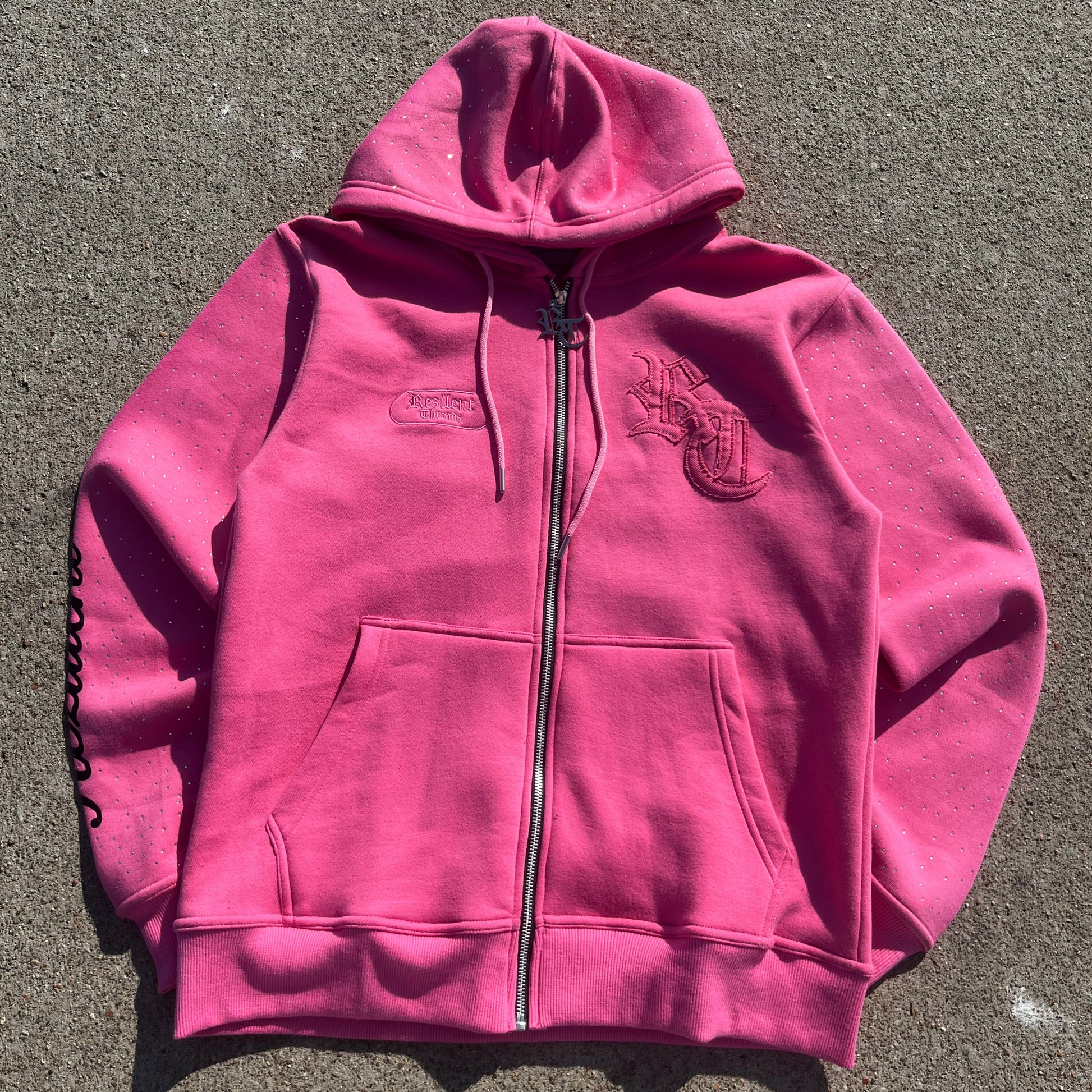Rhinestones along the sleeves and hood with "Rezilient" in DTF Print above the right sleeve cuff.